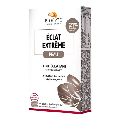 Biocyte Eclat Extreme Caps — пищевая добавка, разработанная для снижения выраженности гиперпигментации, осветления кожи и уменьшения покраснений. Формула подходит людям, которые стремятся выровнять тон лица, сделать его более сияющим и здоровым. Основу действия составляет комплекс активных компонентов, направленных на регулирование синтеза меланина, защиту клеток от окислительного стресса и поддержку здоровья кожи изнутри. Благодаря высокой биодоступности ингредиентов, продукт обеспечивает накопительный эффект, улучшая внешний вид кожи при регулярном применении.