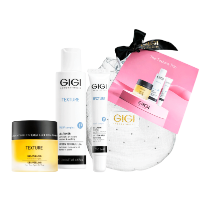 Продукт предназначен для комплексного обновления кожи лица, выравнивания текстуры, очищения пор и повышения упругости кожи. Подарочный набор GiGi The Texture Trio разработан для кожи, склонной к неровному микрорельефу, расширенным порам, тусклости и снижению тонуса, а также подходит для комбинированной и проблемной кожи. Формулы средств работают за счёт сочетания ферментного, кислотного и пептидного воздействия, которое мягко удаляет ороговевшие клетки, очищает поры и стимулирует обновление кожи. При регулярном использовании кожа становится более гладкой, плотной и визуально ухоженной, а тон выглядит более ровным и свежим.
