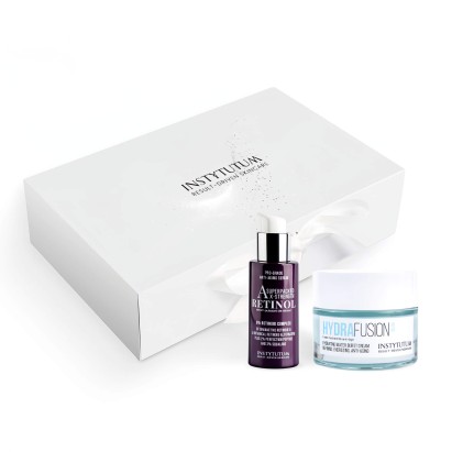 Набор разработан для восстановления сияния и выравнивания тона кожи, улучшения её упругости и сосудистой структуры. Он предназначен для борьбы с тусклостью, неровным тоном, сухостью и первыми признаками старения — особенно актуален для кожи, которая нуждается в освежении, выравнивании цвета лица и повышении тонуса. Благодаря комбинации ретиноида нового поколения и увлажняющего крем-геля кожа получает стимул к обновлению клеток, интенсивное увлажнение и заметное улучшение текстуры. Формула мягко обновляет эпидермис, стимулирует синтез коллагена и гликозаминогликанов, улучшает плотность кожи и возвращает ей здоровое сияние.