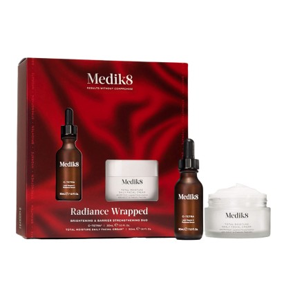Набор Medik8 Radiance Wrapped создан для комплексного осветления кожи и укрепления её естественного защитного барьера. Он идеально подходит для тусклой, обезвоженной и уставшей кожи, склонной к неровному тону и потере упругости. Благодаря сочетанию мощного антиоксиданта витамина С и глубоко увлажняющего крема, набор обеспечивает заметное выравнивание тона, уменьшает пигментацию и возвращает коже здоровое сияние. Формулы действуют синергетически — активные ингредиенты защищают клетки от окислительного стресса и способствуют восстановлению липидного барьера, делая кожу мягкой, гладкой и устойчивой к внешним факторам. Уже после нескольких применений кожа выглядит более свежей, увлажнённой и светящейся.