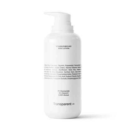 Сертификаты и награды: На данный момент продукт Vitamin Enriched Body Lotion не имеет зарегистрированных международных экологических сертификатов, таких как Ecocert или COSMOS. Однако бренд Transparent Lab придерживается строгих европейских стандартов производства и безопасности. Все формулы разрабатываются с учётом дерматологических требований и проходят внутренние проверки качества. Продукт широко одобряется в профессиональной среде за продуманный состав и эффективность, подтверждённую потребительскими отзывами.