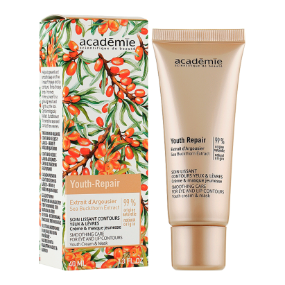 Сертифікати та нагороди: Youth Repair Smoothing Care Eye & Lip Youth Cream & Mask відзначений французьким сертифікатом якості Made in France і сертифікований за стандартами GMP. Продукт отримав визнання професійних косметологів за високу ефективність і безпечність при догляді за чутливими зонами. Academie регулярно отримує нагороди за інноваційні формули та науковий підхід. Засіб рекомендований експертами як професійний догляд для щоденного використання.