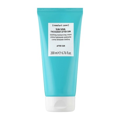 Comfort Zone Sun Soul Face & Body Aftersun – це заспокійливий крем, спеціально створений для зволоження та відновлення шкіри обличчя та тіла після перебування на сонці. Продукт призначений для зниження дискомфорту, спричиненого впливом ультрафіолету: він допомагає усунути відчуття жару, зменшити почервоніння та попередити зневоднення шкіри. Засіб ідеально підходить для всіх типів шкіри, включаючи чутливу, і рекомендований для використання дорослими та підлітками після засмаги. Завдяки комплексу натуральних масел та біоміметичного пептиду DNA-Defense крем активно підтримує шкірний бар'єр та сприяє регенерації клітин. Легка текстура та формула без силіконів та мінеральних масел роблять продукт комфортним для щоденного застосування навіть на подразненій чи сухій шкірі.