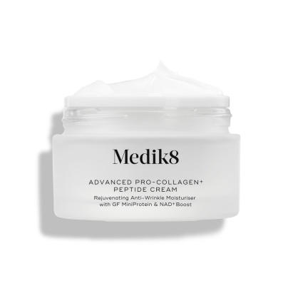 Зволожувальний крем Medik8 Advanced Pro Collagen + Peptide Cream створений для відновлення пружності, гладкості та молодості шкіри. Він призначений для боротьби з ознаками старіння, сухістю, тьмяністю та втратою еластичності, роблячи шкіру щільною, сяйливою та свіжою. Крем ідеально підходить для вікової, зневодненої та стресованої шкіри, а також для тих, хто прагне продовжити її молодість. Завдяки технології з пептидами та колагеном засіб стимулює вироблення власних білків шкіри, зміцнює її структуру та захищає від руйнування колагенових волокон, запобігаючи появі зморшок і в’ялості.