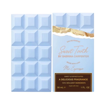Упаковка аромату Sweet Tooth Me Espresso виконана в оригінальному дизайні, що нагадує плитку шоколаду, що відразу викликає асоціації з гурманським та солодким характером композиції. Ніжний блакитний колір надає образу витонченості та легкості, створюючи контраст з насиченою та чуттєвою суттю аромату. Золоті акценти та витончені написи додають нотку розкоші та підкреслюють преміальність продукту. Такий дизайн не тільки виділяється серед класичних флаконів, а й перетворює аромат на стильний аксесуар, який приємно тримати в руках або дарувати.